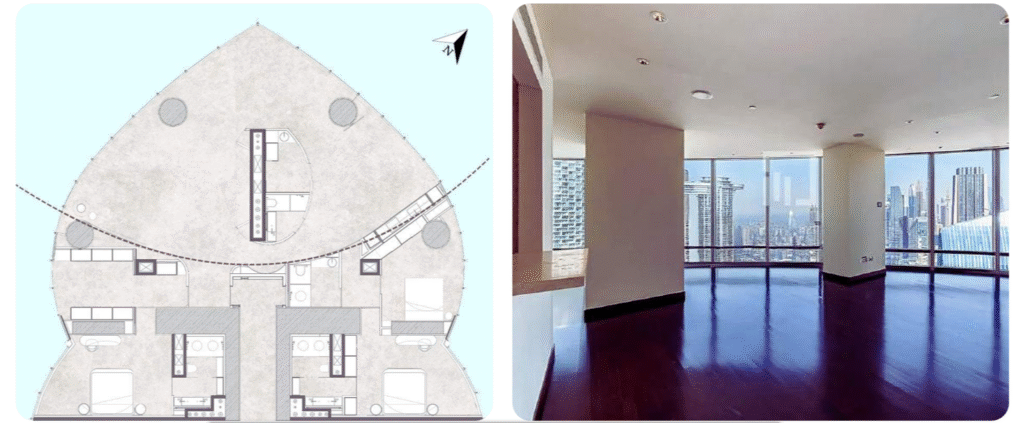 Le projet consiste à transformer un appartement de près de 300 m² situé dans la tour résidentielle la plus prestigieuse/haute du monde. Un bien “trophy asset” de ce niveau attire naturellement une clientèle internationale très solvable (loin de la classe C 😎), ce qui augmente le potentiel de revente à court terme.